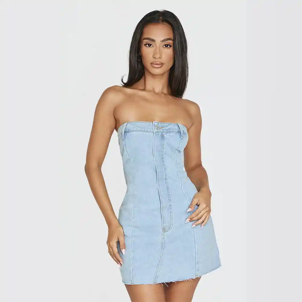 Be the first to review “Petite Light Blue Wash Denim Bandeau Mini Dress”