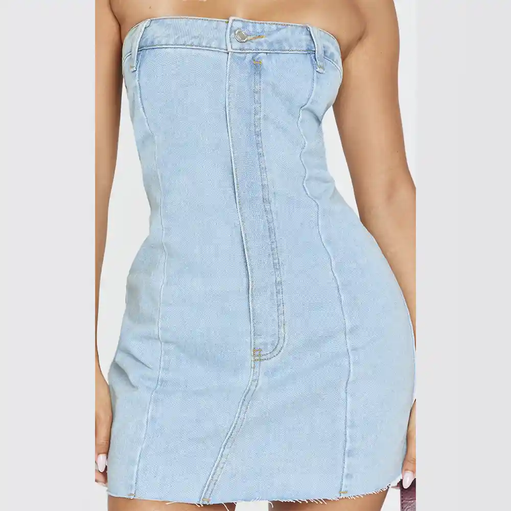 Petite Light Blue Wash Denim Bandeau Mini Dress